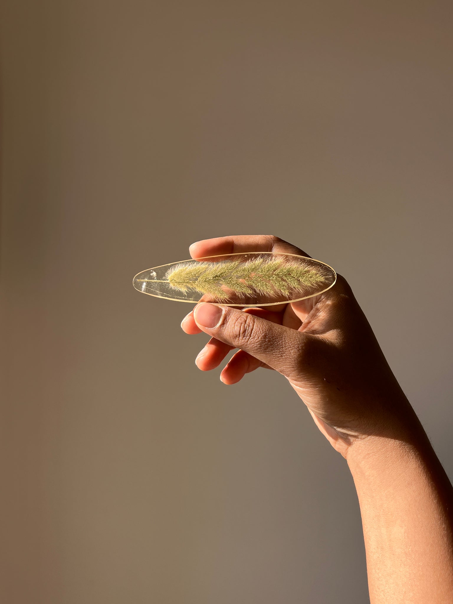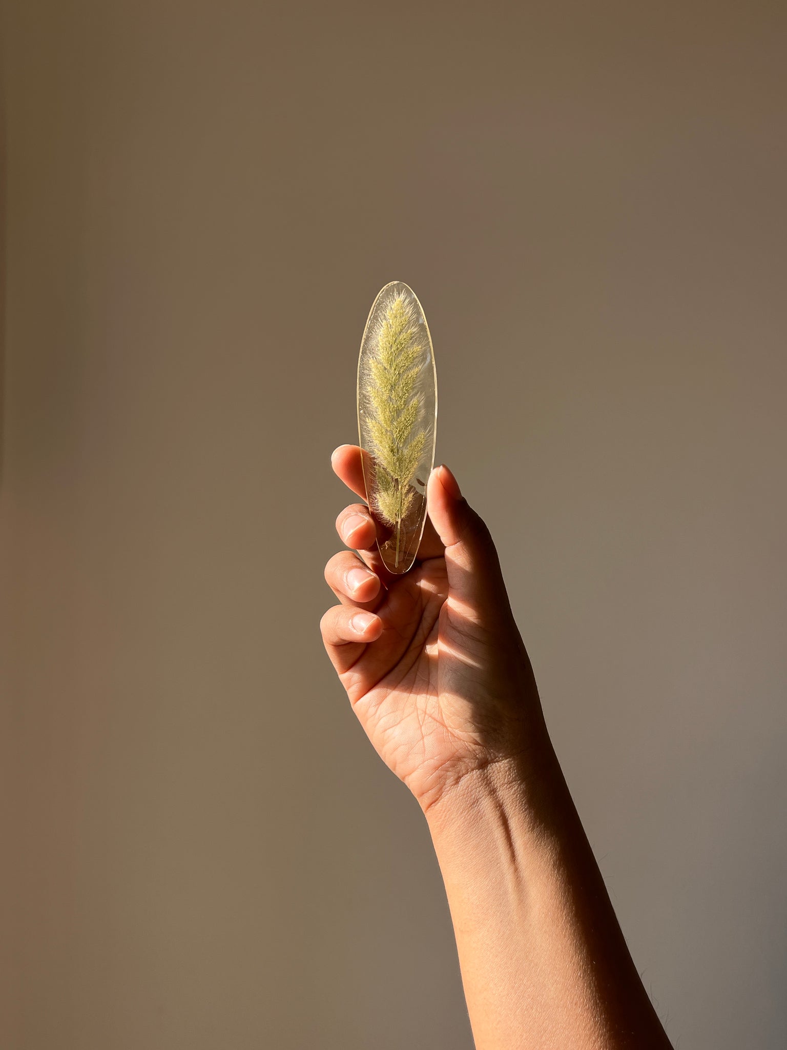 The transparent resin showcases the delicate fuzziness of the botanical, creating an eccentric form unique to each, that adds elegance to any book. The "as-is' (meaning - in its shape as is), this bookmark is a perfect blend of functionality and charm, making it an ideal gift or a unique personal keepsake.