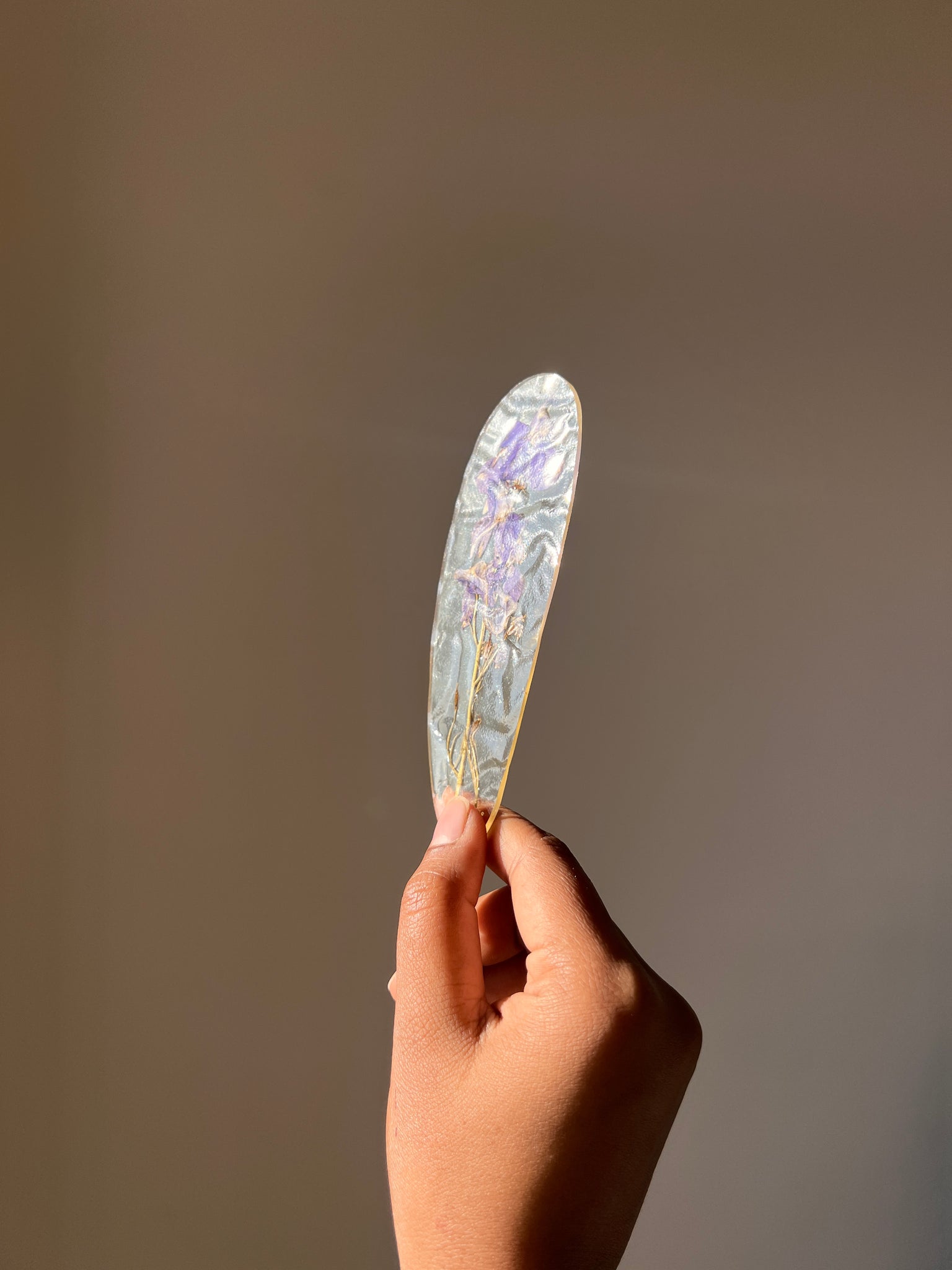 The transparent resin showcases the delicate details of the botanical, creating an eccentric form unique to each, that adds contrast and elegance to any book. The "as-is' (meaning - in its shape as is), this bookmark is a perfect blend of functionality and charm, making it an ideal gift or a unique personal keepsake.