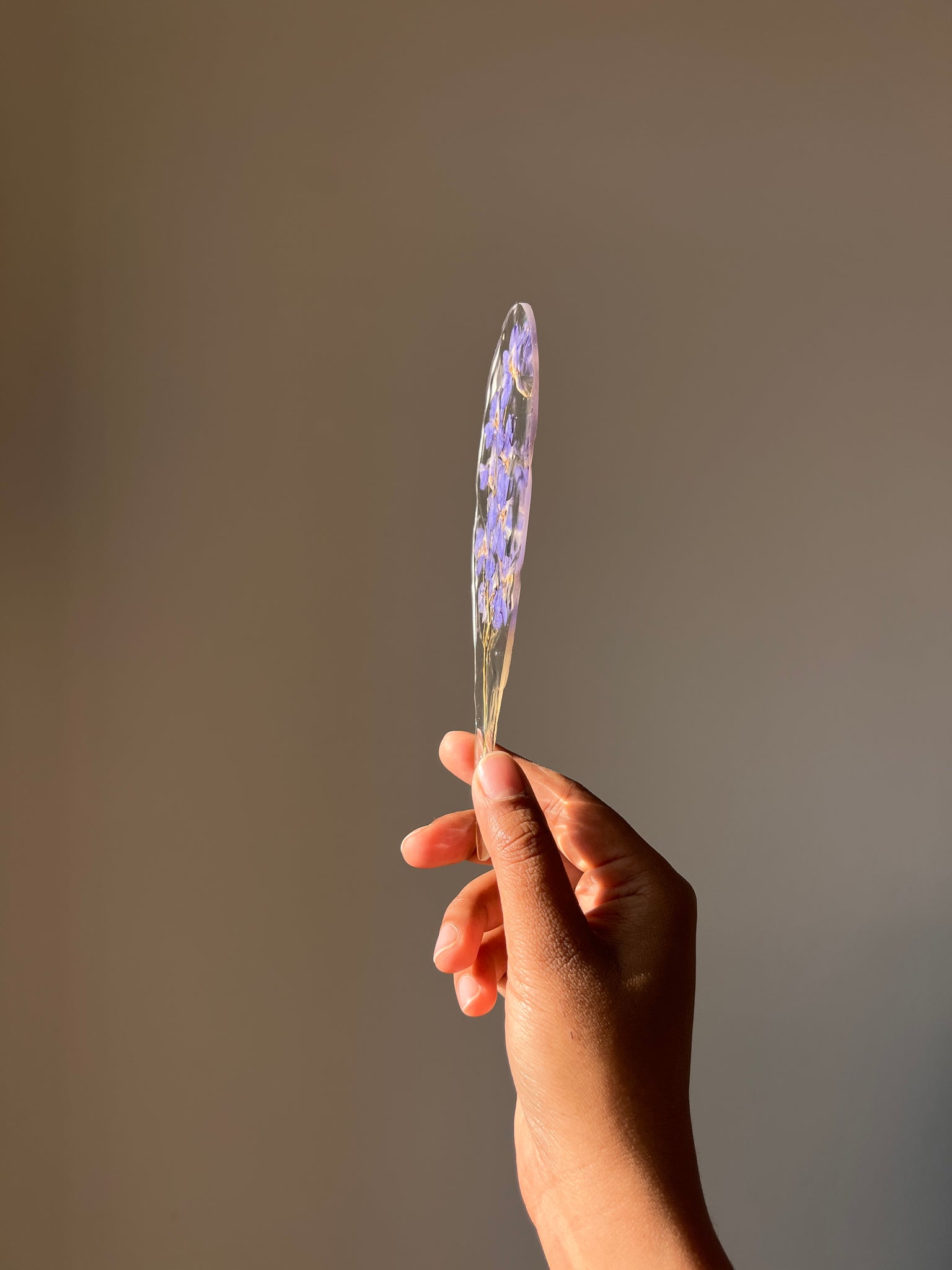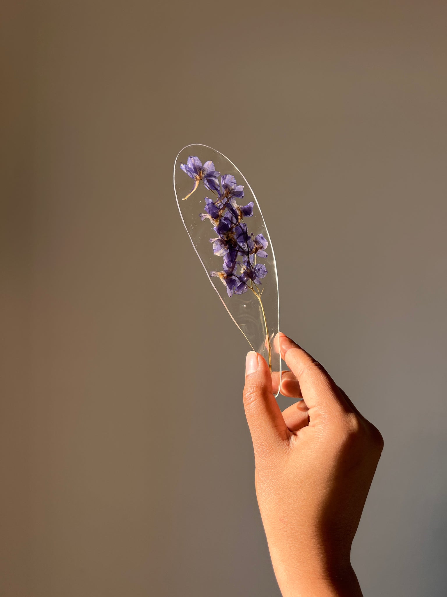 The transparent resin showcases the delicate details of the botanical, creating an eccentric form unique to each, that adds contrast and elegance to any book. The "as-is' (meaning - in its shape as is), this bookmark is a perfect blend of functionality and charm, making it an ideal gift or a unique personal keepsake.